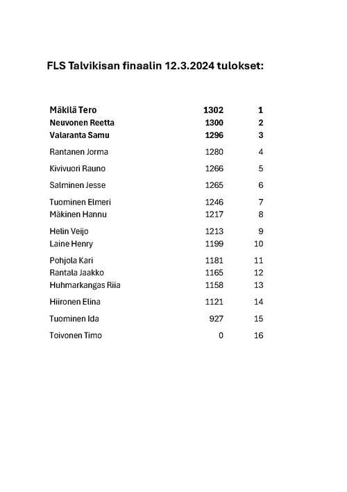 Keväällä 2024 heitettiin FLS Talvikisa Forssan keilahallissa. Kilpailun voiton nappasi paikallinen keilaaja Tero Mäkilä. Toiseksi sijoittui Reetta Neuvonen ja kolmanneksi Samu Valaranta.